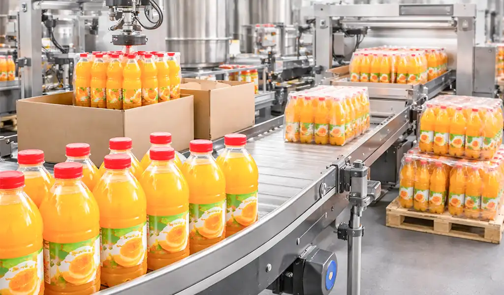Auto shrink wrapping machine wraps juice containers in shrink film for secure packaging, while the carton packing machine arranges and packs them into cartons for distribution.